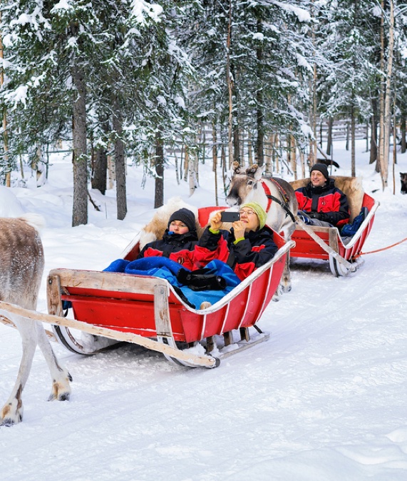 Por la mañana, excursión para toda la familia en moto de nieve a descubrir los secretos de los bosques de Laponia. Los adultos conducirán su propia moto de nieve y los peques irán en trineos junto a nuestro equipo de animación remolcados por un experto guía conductor. A mitad del camino pararemos para conocer alguno de los secretos de los elfos y Lappikid.